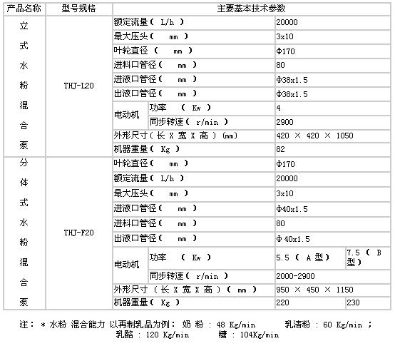 水粉混合泵又稱水粉混合器、水粉混合機,液料混合機,液料混料泵、混合機等THJ-L立式料液混合泵、THJ-F 分體式。外觀獨特,體積輕巧,環保整潔,節能高效、混合迅速、輸送方便等優點,是我們開發研制成功之新一代水粉混合機器。 機器主要工作原理是利用高速旋轉的葉輪將粉狀物料和液體進行充分拌和,輸送出所需的混合物。本設備所吸取之最高溫為80度,也可以用于果汁和其他飲料的生產。使液料快速混合應而達到理想的效益。是食品、飲料行業必不可少的設備之一。特別適用于再制奶的乳制品生產如:適合于奶粉、乳清粉、鈣奶、糊精粉等與流體進行混合,我們為了更好地滿足食品工業、日用化工、醫藥工業、各等行業優質環保的生產加工需要 ,并可按照客戶對加工物料的酸度、堿度、濃稠度等要求特殊定制生產。
