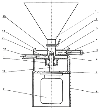 1. 進料斗 2.調節閥 3.泵殼體Ⅰ 4.隔板 5.進液口 6.泵殼體Ⅱ 7.電機座 8.圍板 9.電動機 10.轉軸 11.機械密封 12.出料口13.葉輪 14.蓋形螺帽 15.螺帽