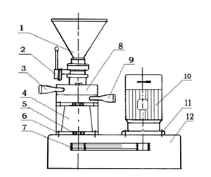 機器由:1.進料斗2.調節閥3.夾箍4.泵蓋5.翼輪6.泵座7.機械密封8.冷卻套9.主軸10.機架11.電動機等組成