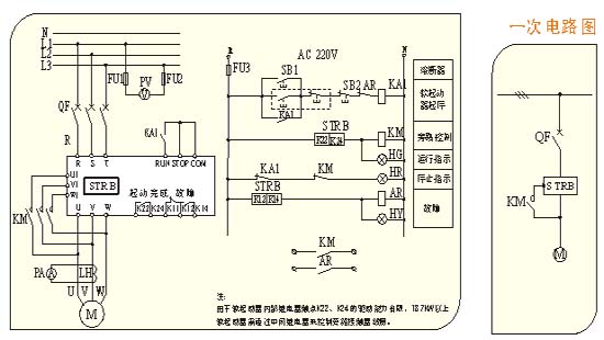 STRG系列電動機(jī)軟起動控制柜是以STRB軟起動器為核心起動元件成套的軟起動控制裝置,軟起動柜內(nèi)配置了三相電源進(jìn)線斷路器、旁路接觸器、預(yù)留了遠(yuǎn)程控制的接口端子,柜門上配有起動、停止按鈕及運(yùn)行、停止、故障指示,同時還配有電流表及電壓表,以顯示電源電壓及電機(jī)運(yùn)行電流。STRG系列產(chǎn)品可直接安裝使用。其接線原理圖見下圖
