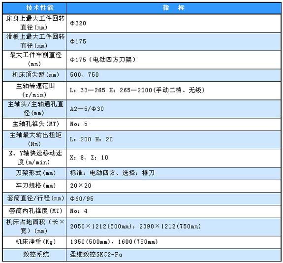 機床有單門半封閉防護(標準配置)和雙門防護(均為選擇配置)三種形式。刀架標配電動四方刀架,亦可選配排刀刀架。機床頂端具有500mm和750mm兩種規格。