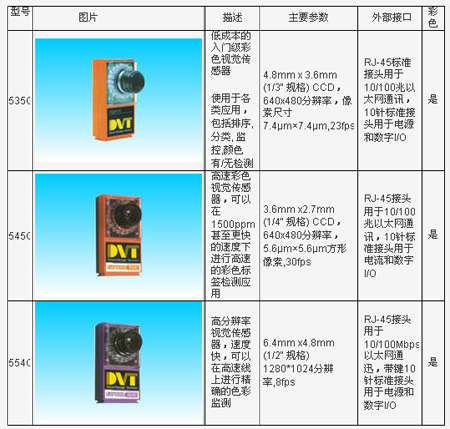 DVT產品系列配有各類彩色視覺傳感器,速度更快,分辨率更高(1280*1024)。Intellect軟件內的轉用色彩工具可以實現多項應用,例如24位色彩監控、色彩分類以及識別,便于新用戶進行設置。高級用戶可以領略到強大的功能,包括色彩過濾、色彩斑點處理,以及監控不同的色彩區域。具體型號包括DVT535C/545C/554C:
