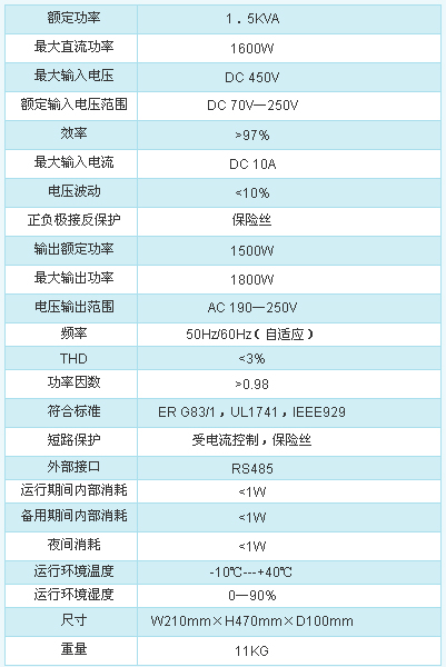 * 諧振軟開關技術使用并網饋電逆變器可靠性更高,電磁干擾小,工作效率高;峰值效率高達97%以上,當不發電時(無風,無光)網側耗電低至1W;