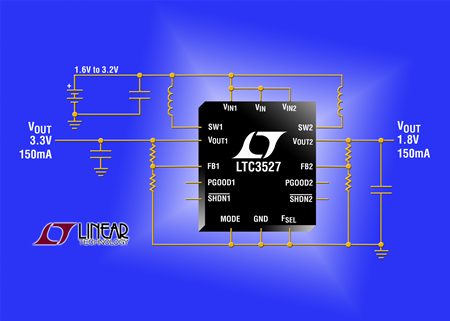 凌力爾特公司 (Linear Technology Corporation) 推出集成輸出斷接功能的雙輸出 2.2MHz、電流模式、同步升壓型 DC/DC 轉(zhuǎn)換器 LTC3527/-1。其內(nèi)部 800mA 和 400mA 開(kāi)關(guān)可以用 0.70V (工作時(shí)為 0.5V) 至 5V 的輸入電壓提供高達(dá) 5.25V 的輸出電壓,使這些器件非常適用于鋰離子/聚合物或單節(jié)/多節(jié)堿性/鎳氫金屬電池應(yīng)用。LTC3527/-1 可以從單節(jié)堿性電池提供高達(dá) 200mA 和 100mA 的連續(xù)輸出電流 (在 3.3V),或從兩節(jié)電池提供 400mA 和 200mA 電流。同步整流實(shí)現(xiàn)了高達(dá) 94% 的效率,同時(shí)突發(fā)模式 (Burst Mode®) 工作將靜態(tài)電流降至僅為 12uA,可延長(zhǎng)手持式應(yīng)用的電池工作時(shí)間。可選的 1.2MHz 或 2.2MHz 工作允許在最高效率或最小解決方案占板面積之間進(jìn)行選擇。3mm x 3mm QFN-16 封裝加上高開(kāi)關(guān)頻率最大限度地減小了電感器和電容器的尺寸,可組成手持式應(yīng)用所需的纖巧占板面積解決方案。