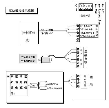 WZM-2H090MH型驅(qū)動器需要外部提供二組交流電源,通常由一個變壓器的兩個獨立繞組提供,而不能用中心抽頭方式。其中一組交流AC1(16V/0.6A)為驅(qū)動器控制用電源;另一組交流AC2(40-60V)為驅(qū)動器驅(qū)動用電源。AC2電壓范圍為AC(40-120)V;電流值根據(jù)電機相電流確定,一般選擇為電機相電流相同。如果電機轉速較低,可以選擇為較低的驅(qū)動電壓;如果電機轉速較高,可以選擇為較高的驅(qū)動電壓。