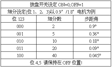 本驅(qū)動器是用驅(qū)動器上的拔盤開關來設定細分數(shù)及相電流的,根據(jù)面板的標注設定即可;請您在控制器頻率允許的情況下,盡量選用高細分數(shù);具體設置方法請參考下表: