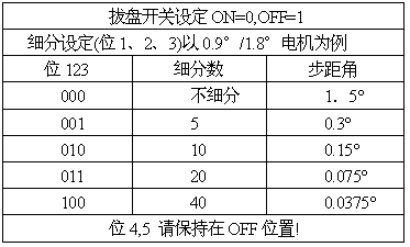 本驅(qū)動(dòng)器是用驅(qū)動(dòng)器上的拔盤(pán)開(kāi)關(guān)來(lái)設(shè)定細(xì)分?jǐn)?shù)及相電流的,根據(jù)面板的標(biāo)注設(shè)定即可;請(qǐng)您在控制器頻率允許的情況下,盡量選用高細(xì)分?jǐn)?shù)這樣電機(jī)運(yùn)行更加平穩(wěn);具體設(shè)置方請(qǐng)參考下表: