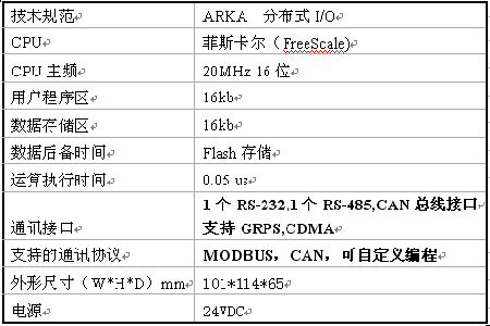 ARKA 系列遠程數據采集器簡介 ARKA系列遠程數據采集器是北京碩人時代科技有限公司開發生產的專為SCADA遠程數據采集系統配套的遠程數據采集設備。 ARKA系列遠程數據采集器采用美國菲斯卡爾PLC專用芯片為主CPU。采用CAN總線作為模塊間通訊總線。 ARKA系列遠程數據采集器可廣泛用于環境監測、熱力監控、水處理、天燃氣管道監測、石油井石油管道監測、交通、路燈、高速公路、電信、物流、園林、環保、養殖等領域的控制和數據采集系統。 ARKA系列遠程數據采集器結構緊湊,體積小巧。 主要特點 緊湊小巧,結構堅固美觀 擴展靈活,適應性強 工業級設計,高度可靠 實時性強,滿足強實時要求 RS232/485/CAN接口,通訊方式靈活 支持GPRS、GSM、CDMA等通訊方式 自帶實時實鐘 技術指標
