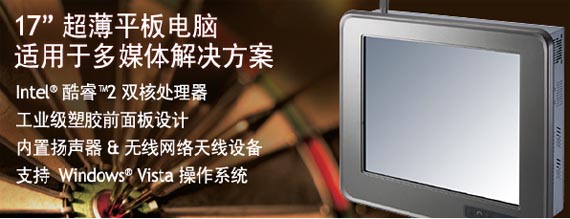 持續(xù)致力于研發(fā)創(chuàng)新應用計算機平臺的領導廠商 - 艾訊股份有限公司 (AXIOMTEK Co., Ltd.),為網(wǎng)絡通訊、工業(yè)以及人機界面等應用領域設計一系列解決方案;發(fā)表全新 17 寸工業(yè)級液晶平板電腦PANEL1178-841,搭載高效能 Intel® 酷睿™2 雙核處理器,內(nèi)建 Intel® Q965+ICH8 高速嵌入式芯片組,提供強大的運算效能及先進的繪圖能力。采用獨特研發(fā)的工業(yè)級前面板,配備 17 寸 1280 x 1024 分辨率的 SXGA TFT LCD 液晶顯示屏。為滿足現(xiàn)今多媒體應用市場的需求,該機種配有 2 組 Firewire (IEEE 1394a)端口、2 組千兆高速以太網(wǎng)口、1 組揚聲器等標準配備,另可選購無線局域網(wǎng)絡通訊模塊,并支持最高 3GB 雙通道 DDR2 系統(tǒng)內(nèi)存;僅有 8.6 公分的輕薄機身設計,使該產(chǎn)品特別適用于無線自助服務站、交互式多媒體信息站、樓宇自動化等空間有限的應用領域。