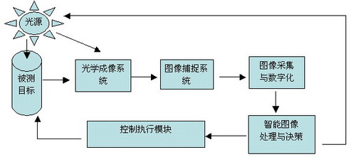 目前,國(guó)內(nèi)機(jī)器視覺(jué)的應(yīng)用研究如火如荼,但不論是將機(jī)器視覺(jué)應(yīng)用于工業(yè)、農(nóng)業(yè)、軍事、科學(xué)研究的各項(xiàng)領(lǐng)域,都離不開(kāi)機(jī)器視覺(jué)開(kāi)發(fā)平臺(tái)的搭建。機(jī)器視覺(jué)是一項(xiàng)綜合技術(shù),包括圖像處理、機(jī)械工程技術(shù)、控制、電光源照明、光學(xué)成像、傳感器、模擬和數(shù)字視頻技術(shù)、計(jì)算機(jī)軟硬件技術(shù)(圖像增強(qiáng)和分析算法、圖像卡、I/O卡等)這些技術(shù)在機(jī)器視覺(jué)中是并列關(guān)系,相互協(xié)調(diào)應(yīng)用才能構(gòu)成一個(gè)完整的工業(yè)機(jī)器視覺(jué)應(yīng)用系統(tǒng)。一個(gè)典型工業(yè)機(jī)器視覺(jué)系統(tǒng)如下圖所示: