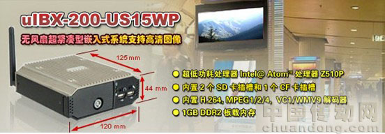 上海,1月21日,2010,全球工業(yè)電腦主要廠商威強工業(yè)電腦,最新推出無風扇超緊湊型嵌入式系統(tǒng)uIBX-200-US15WP。uIBX-200-US15WP支持Intel@ Atom™ 處理器Z510P 1.1GHz,內置2個SD卡插槽和一個CF卡插槽,1GB DDR2板載內存。超緊湊型及無風扇設計,能夠滿足安靜無噪音的應用環(huán)境,如:廣告機播放、圖書館、博物館等。