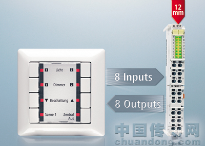 這種高密度總線端子模塊在樓宇自動化領域的應用范圍非常廣泛。例如,集成 8 個 LED指示燈的 8 鍵按鈕,可以直接連接到 12 mm 8 入 8 出的總線端子模塊。通過二線制連接技術,一個 12 mm 輸出端子模塊可以控制 8 個輸出。在輸入端,8 個窗或門觸點也可通過二線制技術連接到 1 個高密度總線端子模塊上。采用這種緊湊型 I/O 端子模塊,可幫助用戶節省控制柜內寶貴的安裝空間,顯著降低每通道成本。此外,該模塊還有另外一個好處,就是可以簡化系統裝配工作。盡管它的封裝密度高,但它的接點排列仍然非常清楚明了,便于安裝。