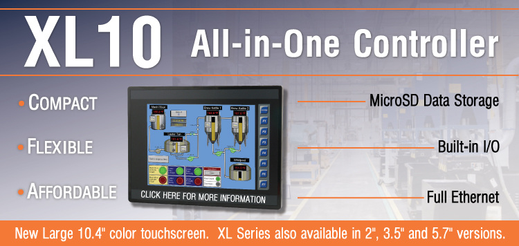 最新推出的XL10一體化真彩控制器為先前的XL系列提供了另一種顯示屏的選擇。XL10系列控制器具有TFT真彩觸摸屏,32,000色彩和分辨率為VGA(640*480像素)。