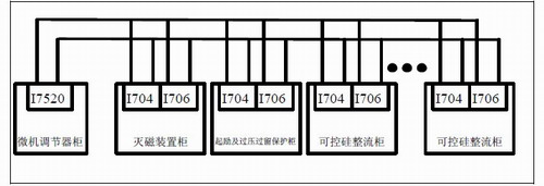 柜內安裝I-7520,柜間聯機采用雙絞屏蔽線。系統的硬件連接如下圖:
