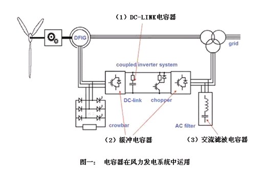現在國家都在大力提倡使用風能、太陽能,這是清潔能源。所以現在越來越多公司在設計太陽能發電、風能發電電源管理系統的時候,選型時主要是高電壓、大容值的電容器有很大的產品需求。比如風能產品系統,有三處運用電容器到這個產品中,第一個可以選用薄膜電容器做高電壓吸收的應用;還有一個是DC-LINK,DC-DC轉換過程中,起濾波儲能的作用;第三個是并網時的抗干擾電容。見圖一所示。